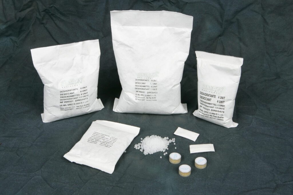 A desiccant is a product that adsorbs molecules. Knowing the correct temperature and humidity is vital to understand what desiccant to use and how much of it is needed. Most desiccants don’t chemically combine with water or the other substances they’re present to protect against. They capture them through adsorption, and stow them away where they can’t cause harm to the product. Our dedicated Customer Support team can help you to decide which size desiccant will fit your needs.
